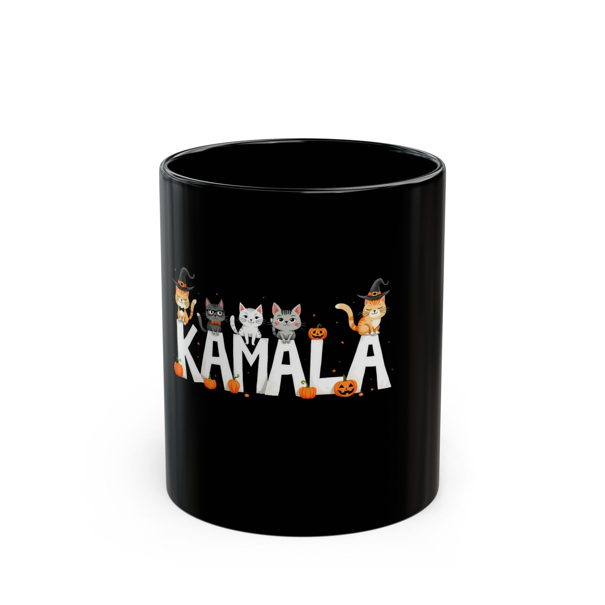 Celebrate Halloween with this adorable 'Kamala' design featuring cute cats dressed in witch hats and surrounded by pumpkins. Each cat has its own unique charm, from the one wearing glasses to the one with a bow tie, bringing a whimsical touch to the spooky season. Whether you're a fan of Halloween or cats, this design is sure to bring a smile to your face. Perfect for embracing the festive spirit and adding a playful vibe to your Halloween celebration. Let these charming kitties and pumpkins spread joy and fun as you enjoy this eerie and delightful holiday.