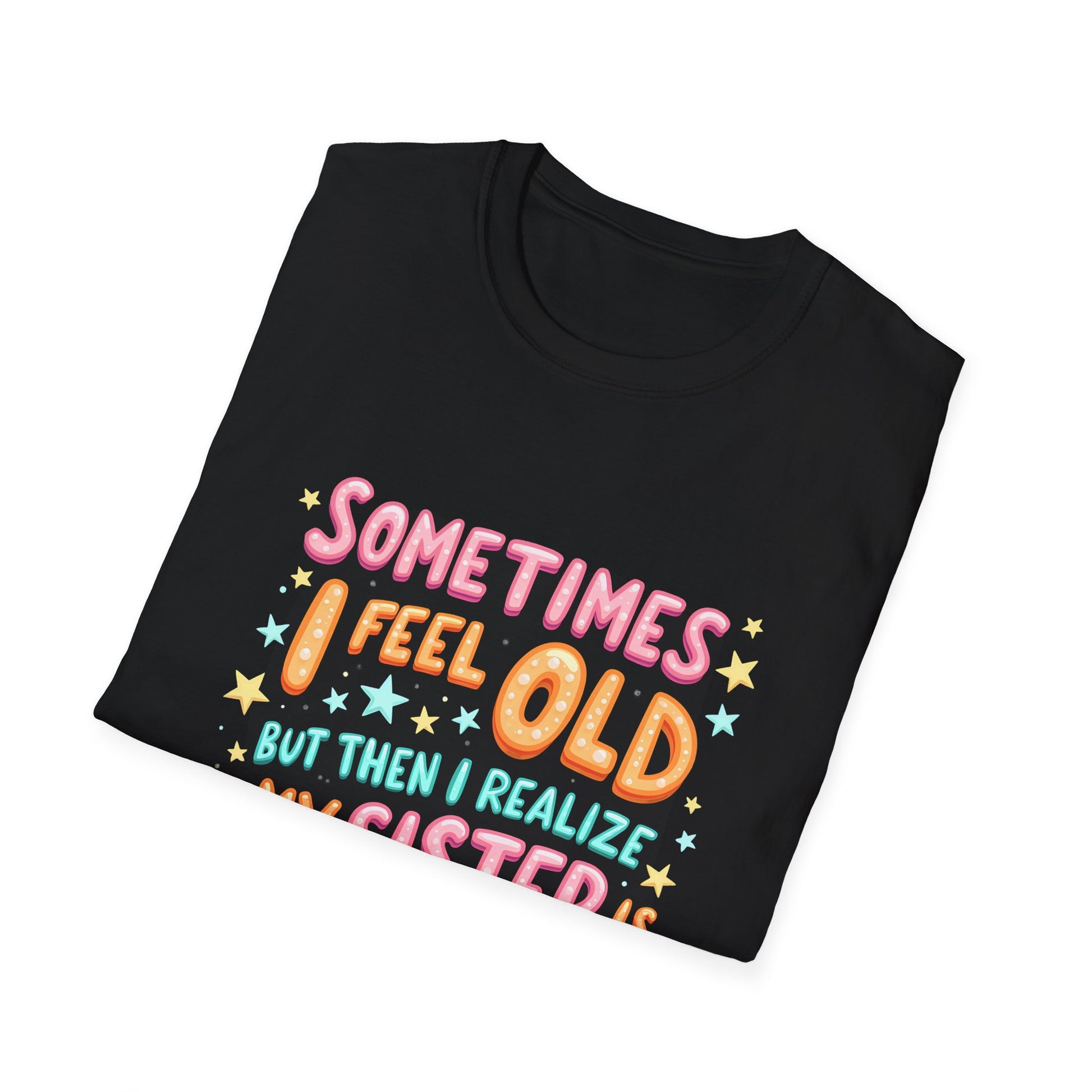 You know that feeling when age starts catching up with you? This playful and colorful reminder will bring a smile to your face. Perfect for siblings who love to poke a little fun at each other, this design captures the essence of sibling rivalry in the most humorous way. It's all about the love and the laughs shared between you and your sister. Bright stars and vibrant letters make the message stand out, reflecting the light-hearted nature of your special bond. Whether you're reminiscing about the past or just enjoying a good laugh together, this is sure to resonate with anyone who has an older sister. It's a celebration of those precious moments and the unique connection only siblings share.